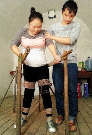 10月12日中午,在冯晓歌家,贺金峰正在帮冯晓歌锻炼学走路,冯晓歌双腿用木板绑着,双手扶着“双杠”,贺金峰双手搀扶着冯晓歌,一步一步慢慢走过来,再一步一步慢慢退回去,不停重复。不一会儿,汗水就浸满了贺金峰的额头。