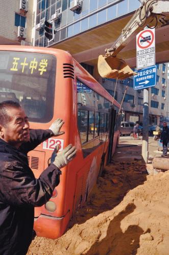公交深陷路面沙坑 吊车相助仍“纹丝不动”(图)
