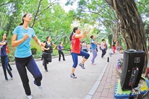 图为昨日上午8时,皇岗公园广场舞爱好者用大音响播放音乐。深圳商报记者 林晓斌 摄