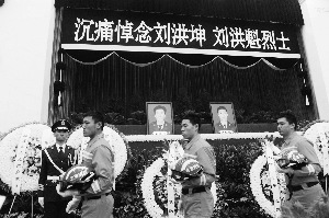 早上7点半左右,烈士刘洪坤、刘洪魁的遗体从殡仪馆起灵,送往八宝山殡仪馆大礼堂,进行告别仪式。刘洪坤、刘洪魁的妻子分别抱着丈夫的遗像,各自在两名女战士的陪同下走进殡仪馆,再次看到丈夫的遗体,两位妻子悲痛欲绝,几近昏厥。