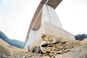 图为记者昨日拍摄到的广深港高铁高峰水库段高架桥底座平台开裂情况。 深圳商报记者 林晓斌 摄