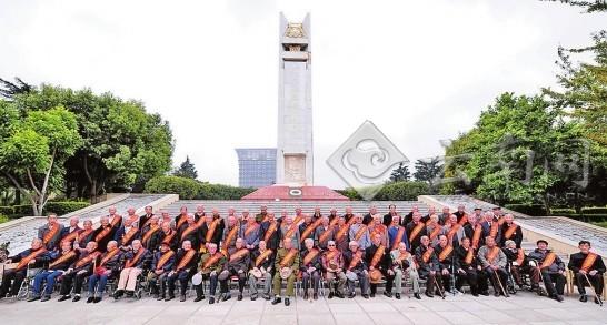 老兵们聚在昆明抗战胜利堂人民英雄纪念碑下合影 记者 周明佳 摄