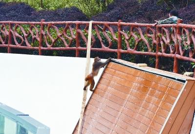 三下两下,这只猴子便逃离猴山。 本报记者 王成兵摄