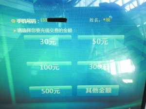 记者首先给一个神州行号段的手机号码进行话费充值。在自助机触控屏幕上点选充值按钮并按照提示输入手机号码后,进入选择充值金额额度的操作界面。此时,界面顶部第一行是号码信息,完全显示11位手机号码,姓名部分,记者的姓氏用“*”隐去,仅显示单字的名。