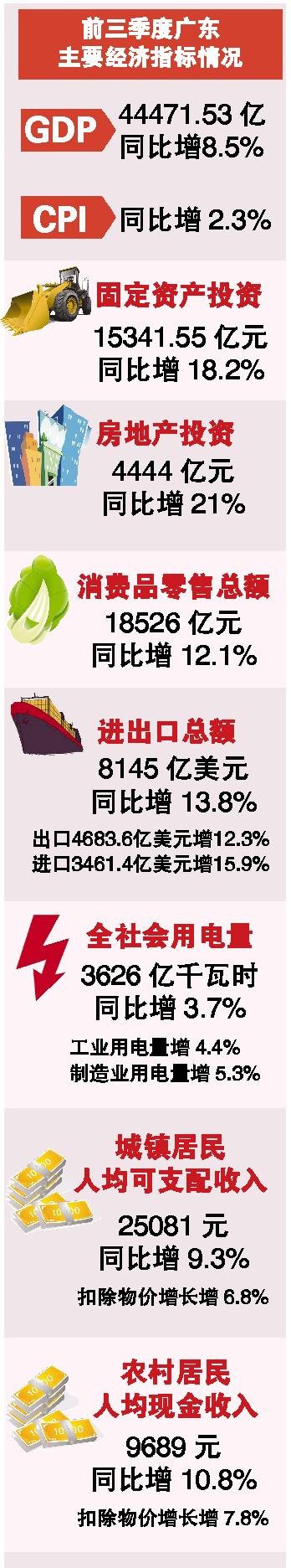 广东前三季度GDP增8.5% 民生占财政支出六成多