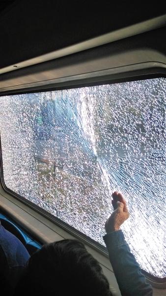 被砸中的车窗玻璃布满裂纹,中央还有小孔。徐丹丹 供图