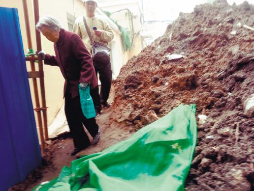 按照指示,记者向东走了10米左右,就看到一张标记着“门诊、急诊”的指示牌,按照指示牌上的箭头,向右转。一条宽约3米的小路,人来人往。医院正楼墙边是用铁管搭成的支架,三五个工人正在支架上干活。支架的旁边是一块土坡,土坡上不规则地放着几块木板,走过时,有的木板轻轻翘起。但是如要到门诊、急诊,却只有土坡这一条路。