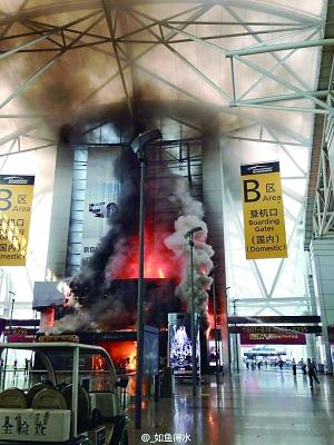 白云机场股份有限公司总经理助理周洪清介绍,27日上午9时14分,白云机场航站楼出发大厅1号门附近的一块电子显示屏附近突然起火冒烟,火势很快蔓延到电子显示屏下方的商铺。机场消防部门接警后立即赶赴现场展开灭火救援工作,同时机场启动应急救援预案。