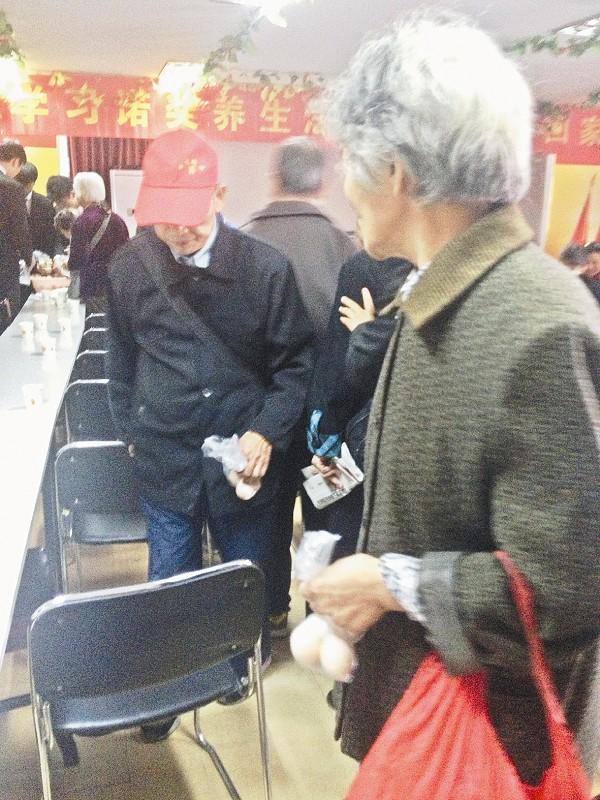 图为:“攻单”现场,一位老人(如图左一)被说服购买了一套制水机
