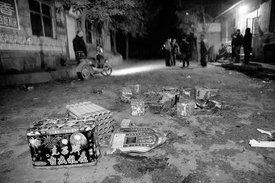 ▲今天上午,王宗泉家门口摆上了花圈,陆续有亲友前来吊唁 ▲昨晚,一户村民家因燃放鞭炮被人砸,有人指认带头的就是王宗泉的孙子 摄/法制晚报记者 吴海浪