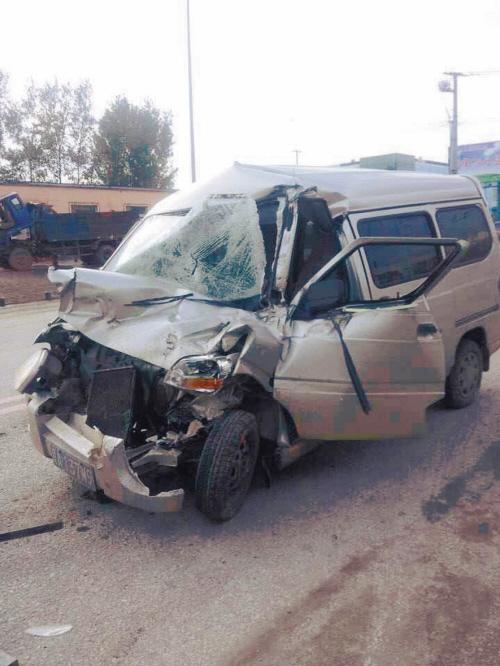 正在转弯之际,由西向东行驶的一辆面包车,一下子撞在了大货车左车门油箱处。不但把大货车的油箱撞瘪了,面包车的发动机也受损严重,司机和副驾驶位上的人员被困在车内,消防队员赶到现场,用扩张器把车门卸下,把被困人员救出。