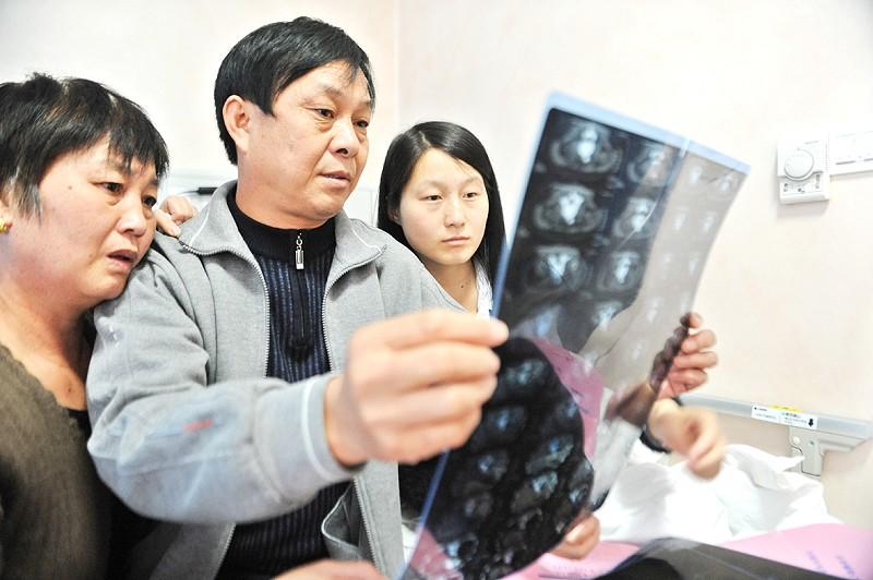 图为:父母正在研究王勤(右一)的病情
