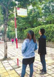 在西华大道联通大厦旁边,记者看到一个简易式的公交站牌:在一根高近2.5米的长杆顶端,设置了长60多厘米、宽不足40厘米的牌子。牌子上涉及几条公交线路,而站点较多的行车路线,就不得不缩小字体。这可难为了在此候车的乘客,离远点儿看,字体太小看不清;走到站牌下,就得使劲仰头看。不少在此候车的乘客纷纷仰着头看路线指示。