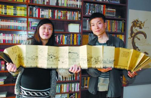 昨日上午,记者来到《龙门石窟全景手绘图》的作者方亚军和张艺的家,两个年轻人都是85后,学艺术设计的他们在2008年大学毕业后结婚,并成立了自己的设计公司。