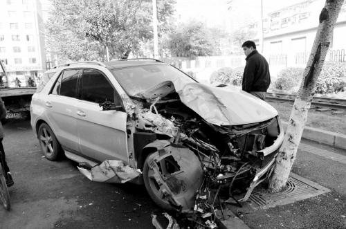 昨天上午,记者赶到大东区草仓路现场时,看见一辆白色的奔驰吉普车顶在路边的一棵小树上,车前机器盖翘起,风挡玻璃破裂,安全气囊弹出,碎片散落一地,现场一片狼藉,看热闹的市民纷纷为这辆破相的豪车感到惋惜。