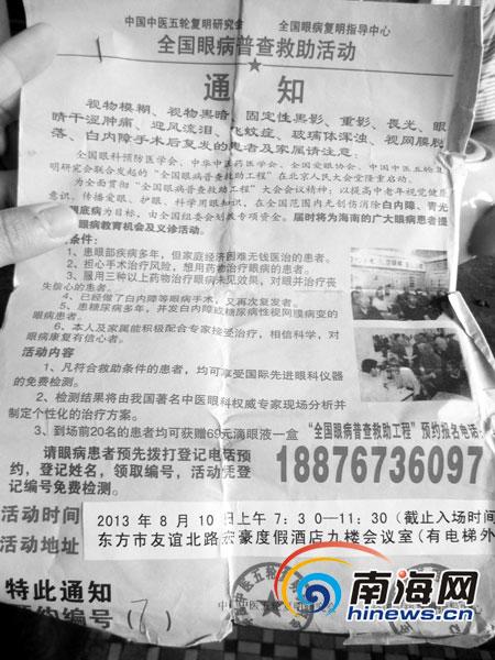 4日,黄大爷拿着广告宣传单找到记者。记者在该广告上看到:“全国眼科预防医学会”、“中华中医药学会”、“中国中医复明研究会”……“全国眼病普查救助工程”向东方市民提供义诊。黄大爷相信这个广告就是因为它顶着这么多的名号。8月30日,因为眼睛不太舒服,黄大爷决定去广告上说的东方市友谊北路某酒店讲座现场看看。
