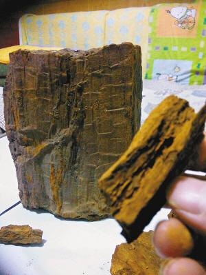 在老乡的指引下,记者沿着一条狭长十余里的山沟,在那里见到了一些被老乡称为“石头树”的木化石。这些大小不一的木化石看上去和树木没什么两样,但是用手去搬动,其却如石头般沉重。仔细看这些木化石,不仅树纹纹理清晰可见,其颜色也各不一样,有些呈米黄色,有些呈淡黑色,还有的呈现为褐红色。