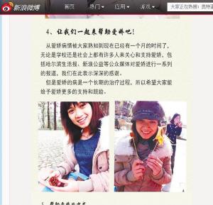 姐妹们找到系主任求助,老师们纷纷为爱娇出谋划策,最终策划了两套方案:一是在全校宣传爱娇的遭遇,校内筹集善款,二是在网上发布“爱娇加油”的微博,在网上公布了两个银行卡号和一个支付宝账户,进行网上筹款,并实时更新捐款明细。几天工夫,学弟学妹就成立了“爱娇加油”行动小组,主要负责网上发帖、每天微博更新爱娇的病情、上传爱娇“心情日记”,“老乡会”成员们通过QQ群、朋友圈等接力宣传扩散爱娇的遭遇,同寝姐妹们仍轮流到医院陪爱娇,为她打气加油……