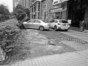 昨日下午,记者来到帝涛豪园小区,在小区楼下的一酒楼门口,多辆汽车停在绿化带上,边缘一侧的花草已被倾轧倒伏在地,绿化带被车轮压出了一道道痕迹,在水泥地面外又扩展了近半个车位。为住户安全,小区原本在两个出入口都摆放了铁栓禁止车辆驶入,不过在酒楼门前,唯一一个车辆出入口又被铁链拴住,旁边甚至还安排专人把守,这块空地几乎被圈占起来成了停车场。
