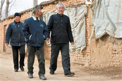 北京密云镇西户部庄村,崔钢林(右一)与妻子朱青霞领着捡来的老哥王世久(中)外出。