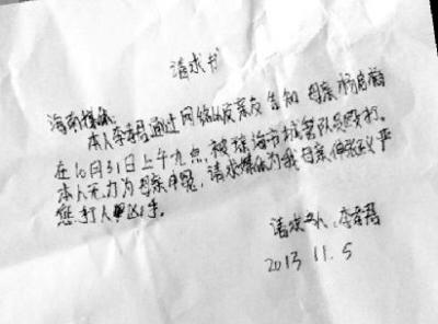 记者从李孝君发来的请求书中看到,李孝君呼吁严惩打人者,“海南媒体:本人李孝君通过网络以及亲友告知母亲杨启梅在10月31日上午9时,被琼海市城管队员殴打,本人无力为母亲申(伸)冤,请求媒体为我母亲伸张正义,严惩打人凶手。”