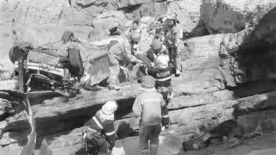 ■ 救援人员合力将五名伤员从坠崖的车辆中救出 万鸿伟 摄
