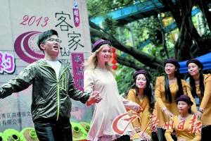 昨日上午, “2013越秀客家山歌邀请赛”初赛在越秀公园小天使广场举行。通过对报名节目的前期选拔,共有40支参赛队伍进入初赛。参赛者既有少年儿童,又有花甲老人,还吸引到了外籍友人参赛。