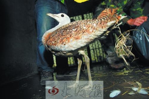 商贩说这两只鸟是越冬过境在黄河堤边“歇脚”时,用网捕获的。他打算把它们卖了赚点钱。看着蜷缩在笼子里可怜的两只鸟,王旭光动了恻隐之心,最终掏出900多块替这两只大鸨“赎身”。12日中午,他将两只鸟转交到河南省野生动物救护中心,才知这是国家一级保护动物大鸨。