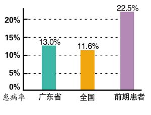 明天是第7个“联合国糖尿病日”。广东省疾控中心最新公布的监测结果可见,全省18岁以上的成年人中,每100人就有13人患糖尿病,比全国成人糖尿病患病率11.6%更高;更需引起关注的是,糖尿病患者的后备大军(糖尿病前期患者),每10人中即有2个。