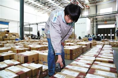 昨日下午,北京一家物流基地,负责扫码打票的员工王雨正在挨个扫描等待发货的白酒。由于发货量激增,他们一天要打1000多张发票。