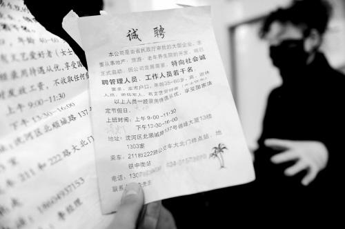 “大型企业、管理人员、35-60岁、本市户口”这几个关键词让高女士看到了希望。拨通对方电话后,招聘人员表示高女士的年龄很符合要求,“我们是做老年养生院,上了年纪的人更适合在这里工作,并且我们不收取一分钱的费用,明天就来面试下吧,您要是气质好,后天就可以开始工作。”