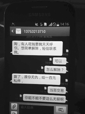 “我真的受不了啦,已经持续了好几天,再这样下去,关机要影响生意,不关机整个人都要精神崩溃。”陶先生说,正在他想报警的时候,一个显示为广东东莞来电的手机号码发来短信,发信人称是收了钱被安排专门用隐藏号码呼叫陶先生的手机号的。发信人还表示,自己与陶先生无仇,不想天天这样呼,如果陶先生愿出100元,他就愿意停止呼入。