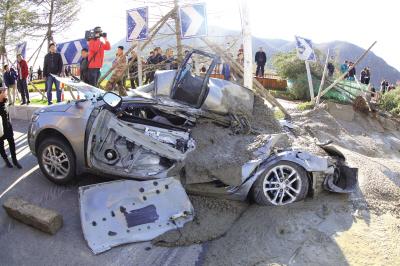 水泥罐车转弯“摔倒” 压扁反向行驶的轿车(图)