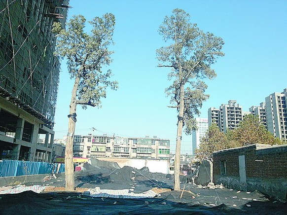 11日中午,在知情村民的带领下,绕过紧张施工的工地,在附近的辰光超市后面,记者看到两棵柏树移植在高楼大厦之间。但古树被锯掉枝杈的伤疤还在,树身部分也被竹板钉住,部分树根裸露在外。