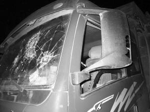 ■大货车被砸,玻璃几乎全被毁。 本报记者 杨东 摄