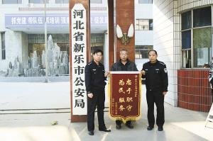 11月11日上午,藁城市某公司工作人员将一面绣有“为民服务、忠于职守”的锦旗专程送到新乐市公安局巡警大队,对新乐巡警真心为民表示衷心感谢。