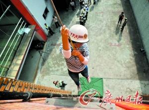 女街坊体验高楼缓降。她站上训练塔的3楼,依靠缓降器、紧握绳索,从半空中降落到地面。 记者邱伟荣 摄