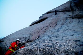 据悉,小庙山山峰有五六十米高,还没到达该山山脚处,救援人员就远远看到小庙山陡峭的一面垂落着一根绳子,被困的男子下降的长度虽然已经超过了山峰总高度的2/3,但距离地面仍然还有15米高的样子。