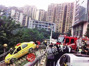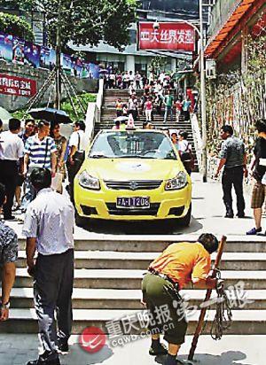 2013年9月20日 地点:南岸区弹子石街道办事处 事件:由于没记清来时的道路,一位出租车司机返回时将车子开下梯坎,险些酿成事故。