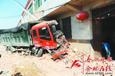 11月17日早上7点多,长丰县双墩镇的余大妈正坐在窗口给孙女梳头,忽然外面传来一阵怪响,紧接着就感到房子震了一下,余大妈拉着孙女就往外跑,眼前的一幕将祖孙俩惊呆了:一辆自卸车横卧在她家门口,车头刚好就抵在她给孙女梳头的窗口。