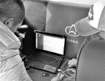 11月1日,赵公口桥附近的一辆面包车上,电脑连接“伪基站”,短信群发商正编写垃圾短信,准备群发。记者 大路 摄