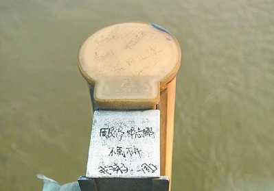 记者昨从黄鹤楼方向上桥,在岗亭不远处看到这些涂鸦。不锈钢灯架上,从上到下写满各类留言,表白的、山盟海誓的应有尽有。记者身高162厘米,将胳膊尽量伸长,也只能够到灯管的1/2处。最下面的留言,有些还是用刀子刻的,如果不是将半个身子探出栏杆外,实难想象是如何刻上去的。