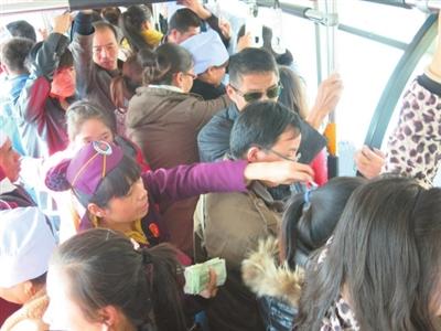 整个车厢挤满了人,售票员穿梭在人群中,收钱、撕票,忙个不停。
