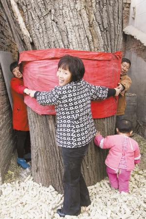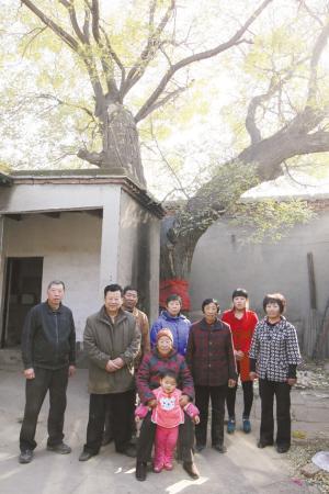 52岁的赵志坤,兄弟姐妹共8人,都是在老槐树下长大的。他拿着手机,挨个儿通知兄弟们和嫁到本村的二姐:“记者来采访啦,一起在老槐树下照张相吧!”其实,每年的大年初四,一大家子60多口人都聚到一起,在老槐树下摆5桌酒席,一家人说说笑笑,开心又热闹。赵志坤85岁的母亲董春梅,也特意从大女儿家赶了回来。“我20岁嫁到这里,跟老槐树生活了65年了!”董春梅说,老槐树从来没有掉下树枝砸到房子或伤到人,全家和谐美满,跟老槐树的庇佑有很大关系。“要拆迁了,最舍不得的就是这棵老槐树呀!”