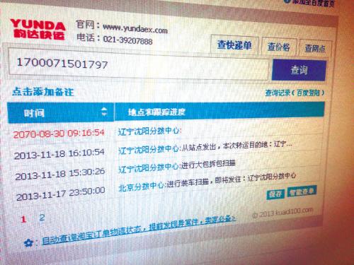 反复看了几遍,小杨都不敢相信是真的。她叫来朋友一起分析,大伙儿也都哑口无言。韵达快递物流跟踪记录显示,2013年11月17日当晚23:50,快递在北京分拨中心进行装车扫描;2013年11月18日15:30在辽宁沈阳分拨中心进行拆包扫描;2013年11月18日16:10运往辽宁沈阳沈河区五公司。最后一条信息时间则是2070年8月30日09:16。