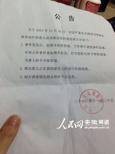 男婴被遗弃后,继续留在安徽省立儿童医院新生儿内科的病房,接受治疗与喂养。直到11月18日,这一天,主治医生查某为他开具了死亡证明。