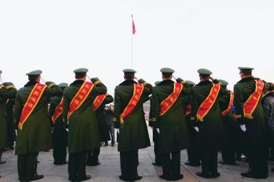 昨天早晨6点30分,天安门广场旗杆南侧,老兵们已排好整齐的方队。每一名战士都昂首挺胸地站立,任寒风拂脸,仍一动不动地注视着曾由自己护卫的神圣广场。