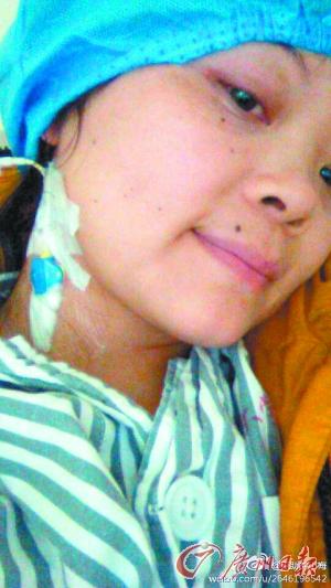大梅在医院治疗时的自拍,当时脖子上还戴着治疗管。