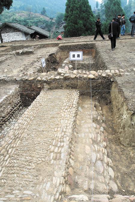 图为老司城遗址中的道路及排水沟,其中道路均用鹅卵石铺设,排水系统则非常发达。 邱晓峰 摄(资料照片)