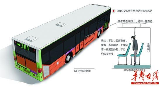 男子被发现时,头部吊在公交车后车门旁最高的抓杠上,双手垂下紧握双拳,脚尖距离地面仅不到10厘米。在后车门右边的并排座外侧的座位上,有一摊血迹。